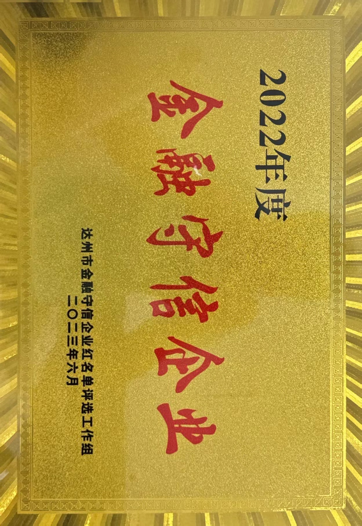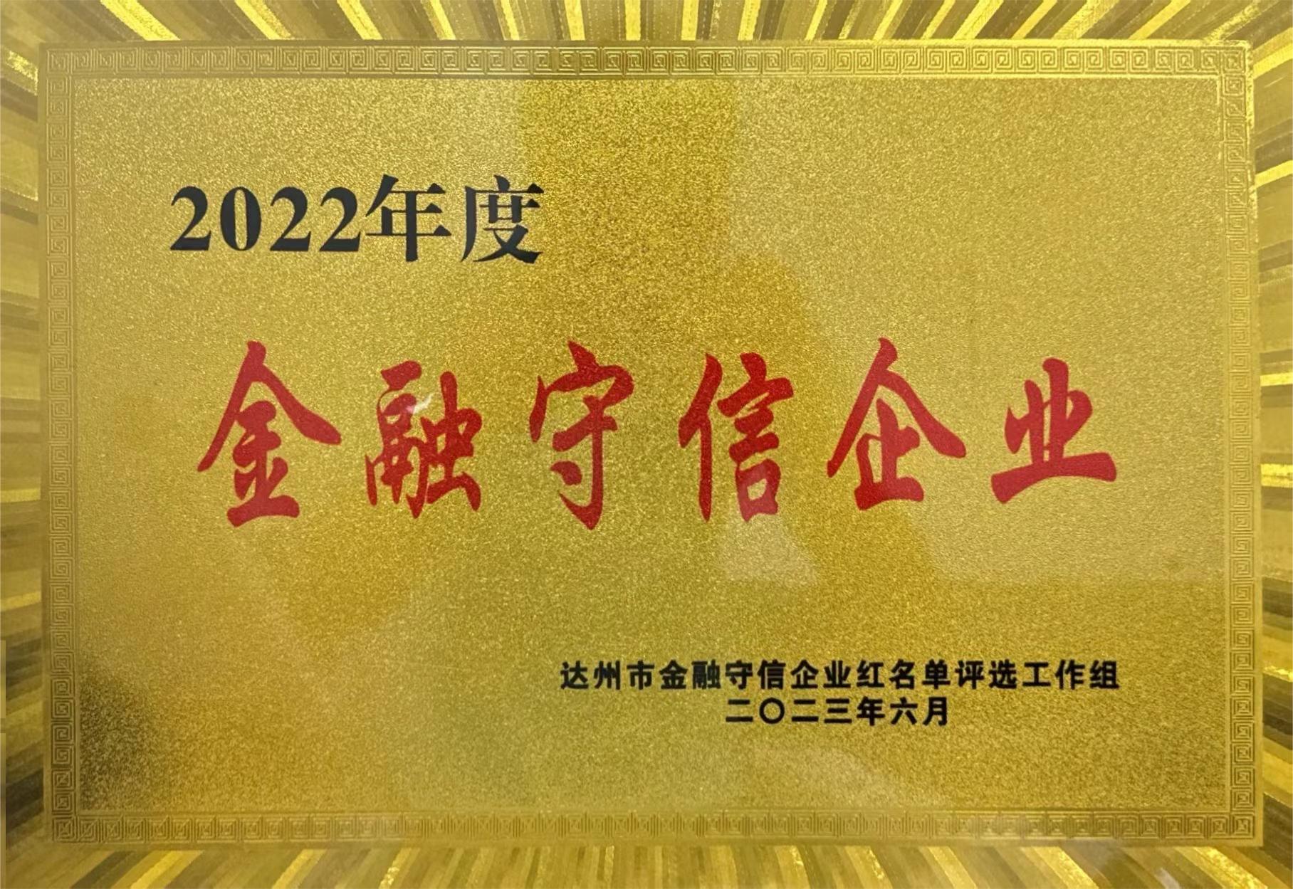 2023年6月經(jīng)我市16家行業(yè)主管部門嚴格審核并公示無異議,評選出了2022年“金融守信企業(yè)”紅名單,我司以良好的信用管理水平獲此殊榮。2023年7月4日農(nóng)業(yè)發(fā)展銀行達州分行正式將牌匾授予我司。
