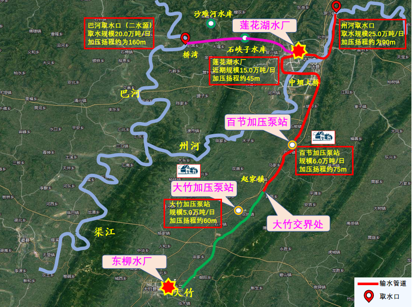 由達州水務(wù)集團負責(zé)實施的“引水入竹”達州段項目,從巴河取水,輸水至蓮花湖水廠,管線途經(jīng)達川區(qū)、通川區(qū)和高新區(qū),終至大竹交界處,輸配水管道101公里,全程三次加壓總揚程280米,總投資12.2億元。