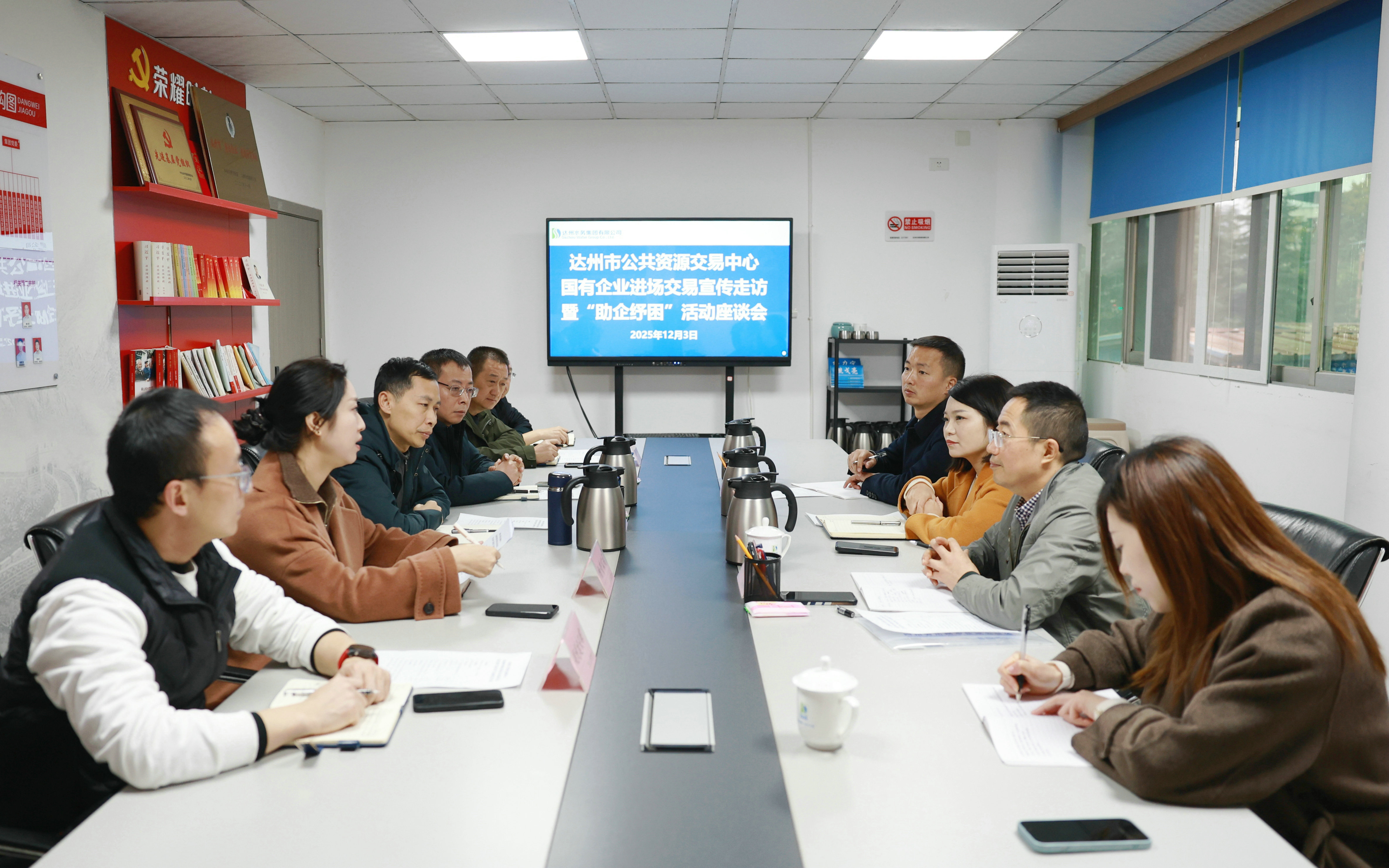 12月3日上午,市公共資源交易服務(wù)中心副主任陳曉云帶隊(duì)赴達(dá)州水務(wù)集團(tuán)開展國有企業(yè)進(jìn)場交易宣傳走訪暨“助企紓困”活動座談會,集團(tuán)黨委委員、副總經(jīng)理?xiàng)盍?,黨委委員、副總經(jīng)理、財(cái)務(wù)總監(jiān)朱亞成和集團(tuán)相關(guān)部門參加。