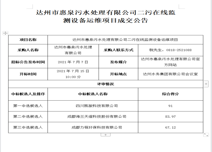 標題:達州市惠泉污水處理有限公司二污在線監(jiān)測設備運維項目成交公告